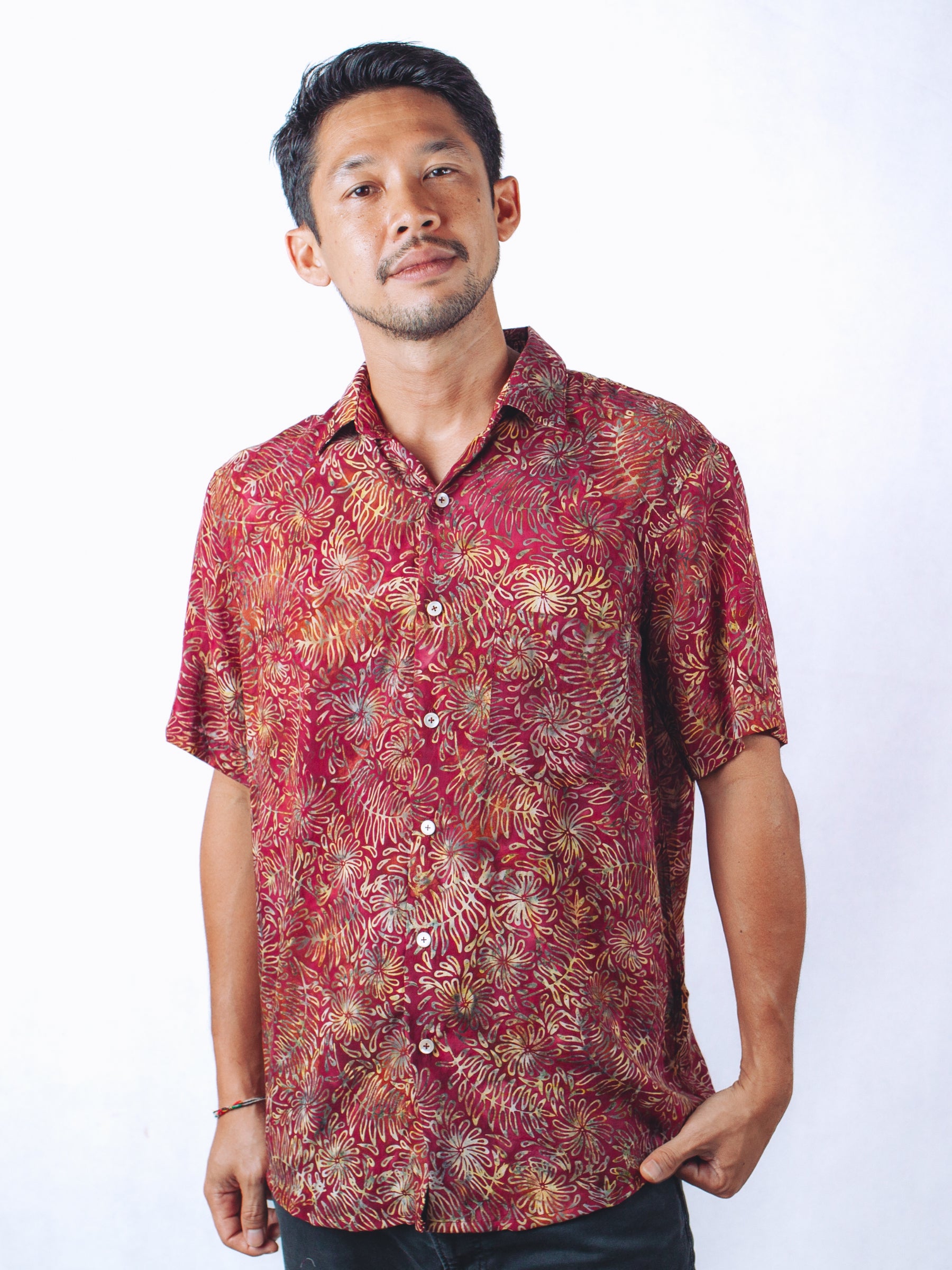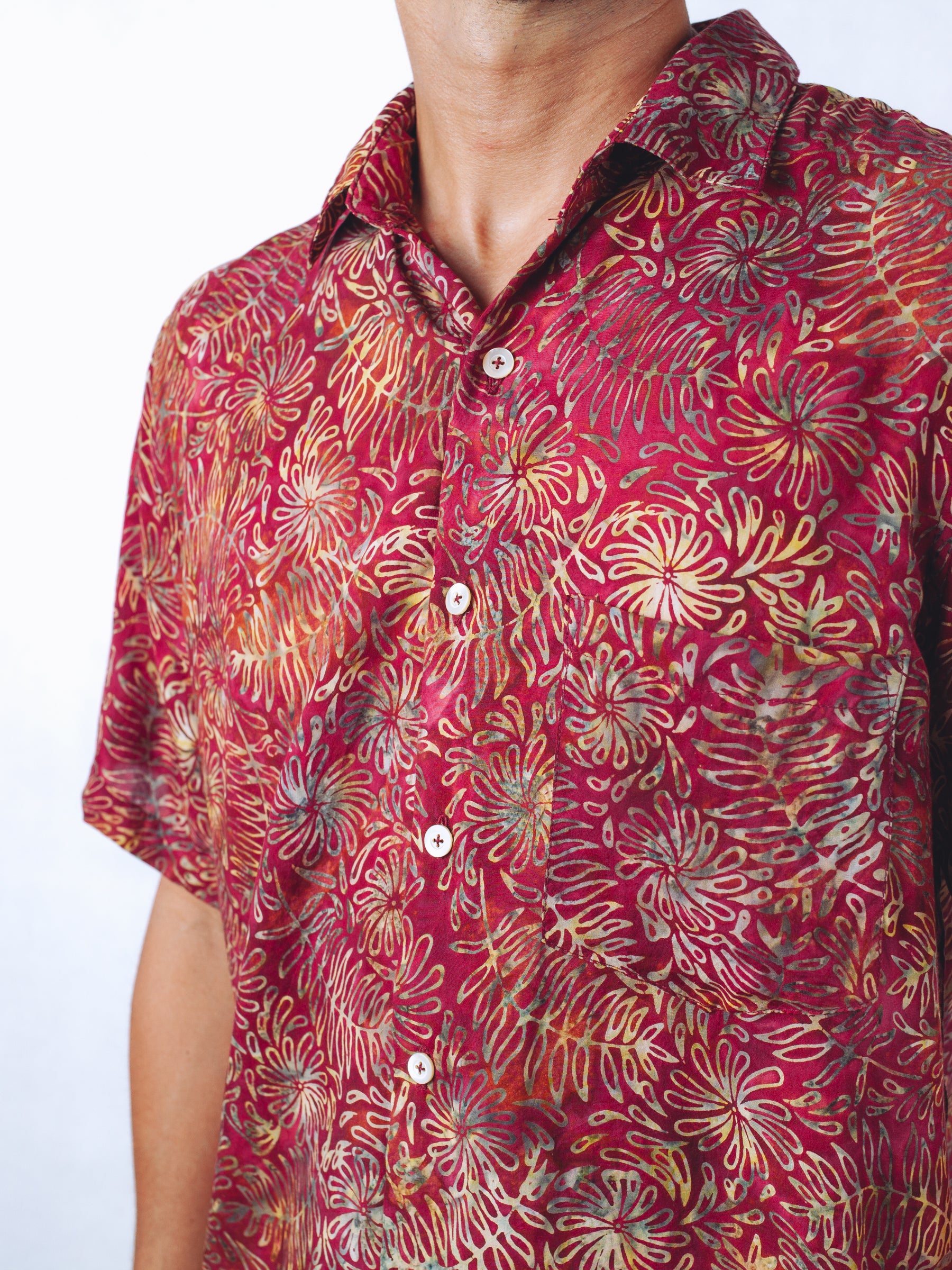 Kebun Raya Original Edition batik shirt in ruby red TENCEL™ Lyocell, front view Kebun Raya Original Edition batik shirt in ruby red TENCEL™ Lyocell, front view