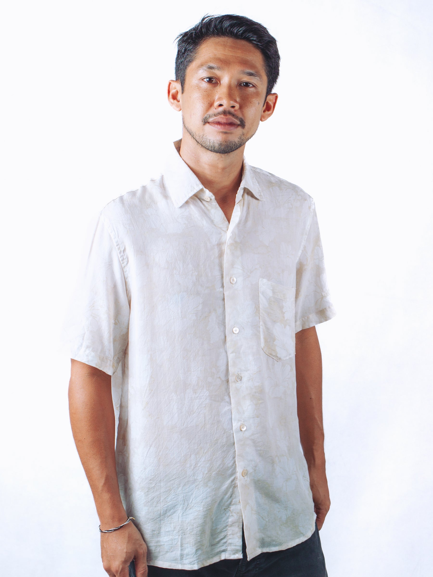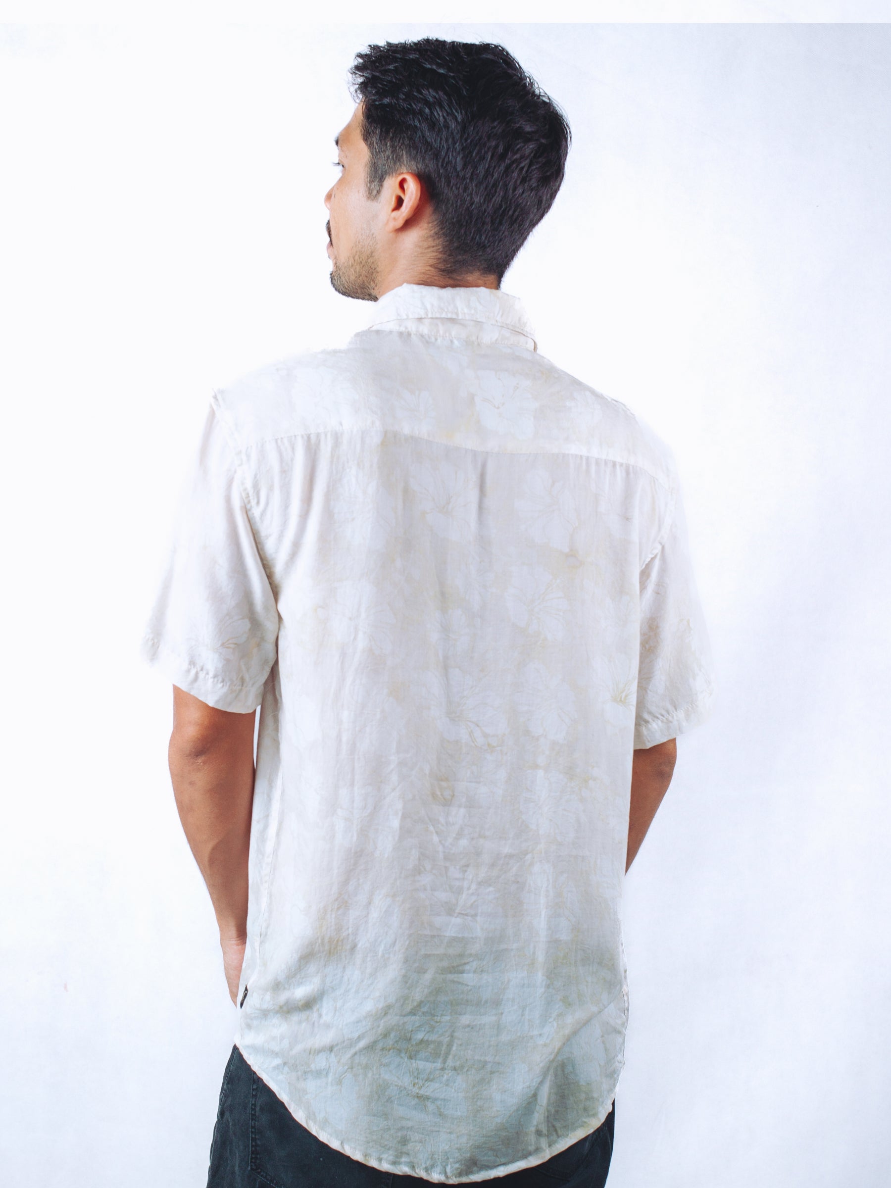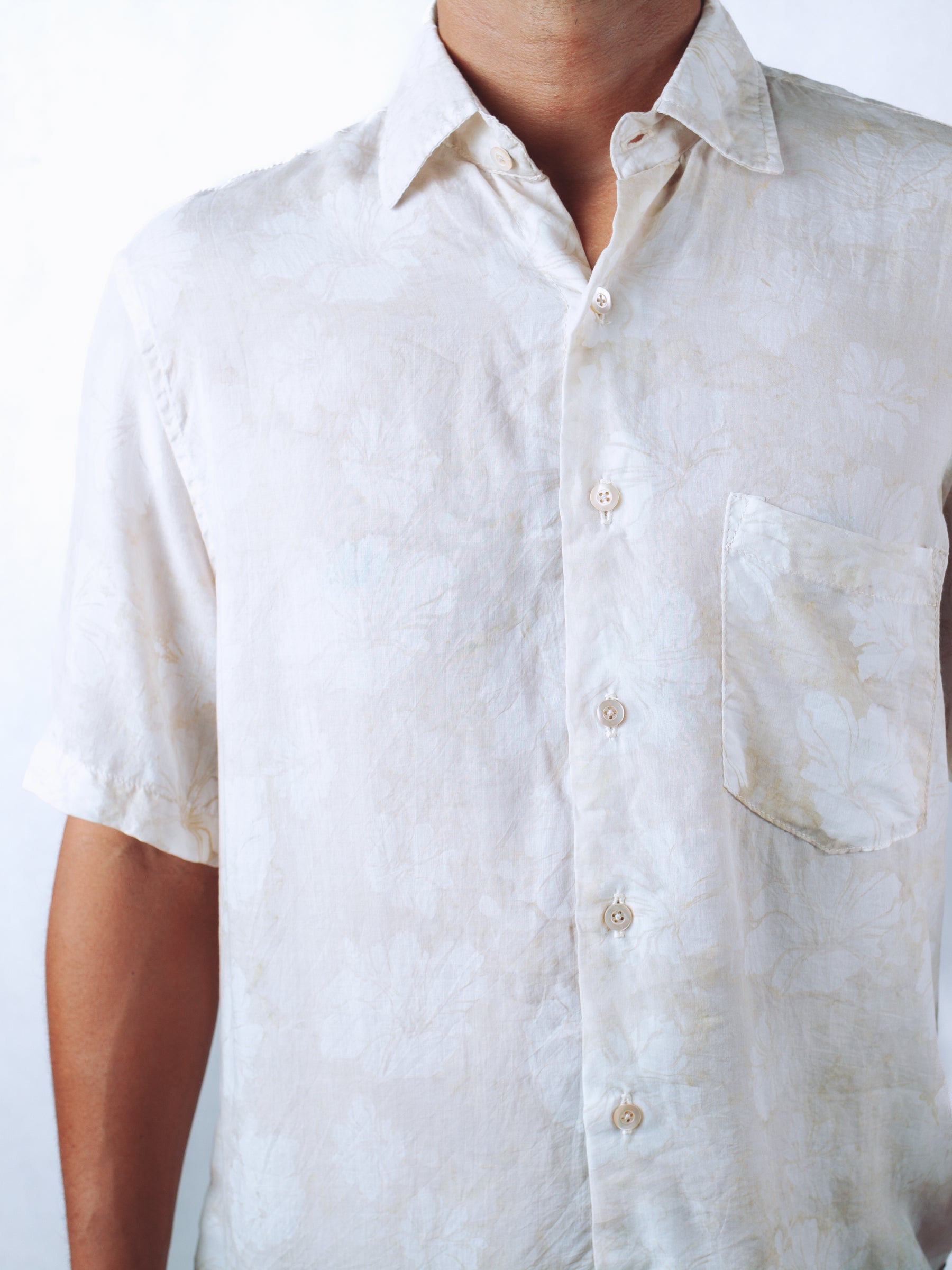 - Beige shirt with pale flower prints and faded effect.